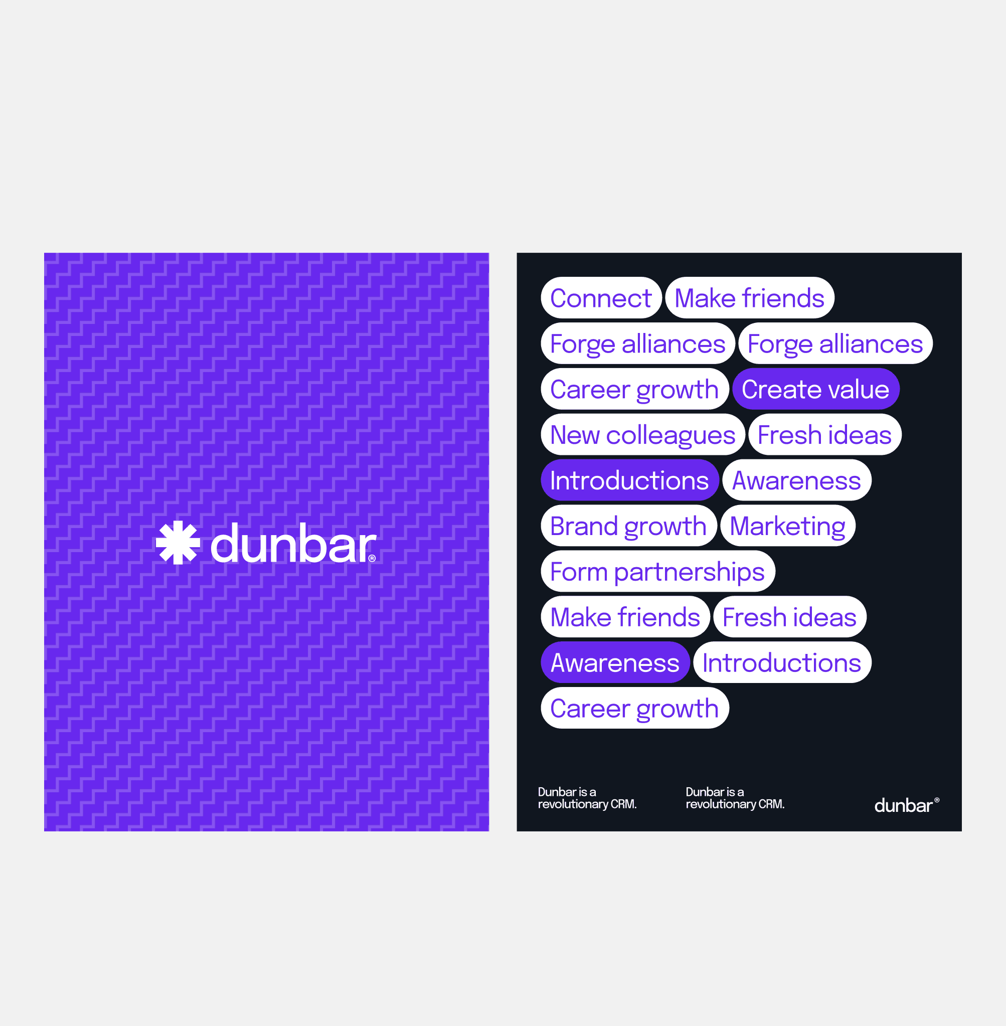Dunbar unlocks your network and helps you connect with the right people, right when you need it. The team at Dunbar came to us with a need to go from 0-1; to define an identity and provide a sleek and modern website. This is how the Dunbar brand identity came to be. It uses bold elements to communicate the idea of connecting people and promoting social growth.